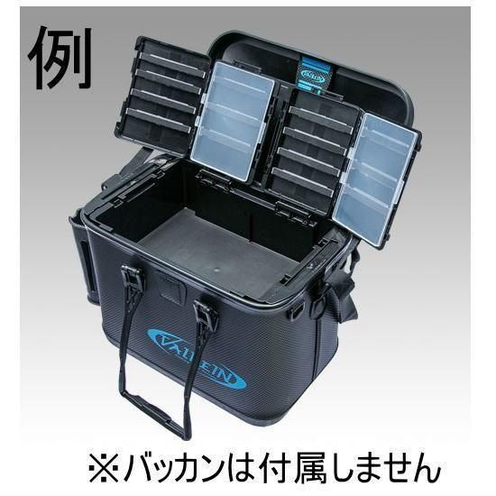 エリアトラウト完全対応!BM-5000、VS-7090Nにセット可能な、中皿一体型収納。エリアトラウトでの使用を想定し、深型の中皿にスプーンなどを収納できるケースがセットされた変幻自在なシステム収納設計。セットされているケースは立ち上げて固定ができ、観音開きで使用できるので、手返しを重視するトーナメンターも納得の使用感。ケースは最大2個取り付けられ、それぞれ観音開きで両サイドにはみ出るように広げることも可能だが、1個だけ装着して使うこともできるので物量に応じて選択可能。